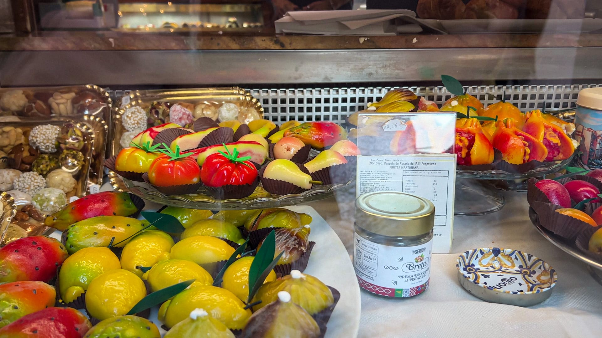 Martorana is also connected to a popular Sicilian pastry called Frutta Martorana – fashioned and shaped marzipan, that resembles real pieces of fruit. Legend has it, the emperor (or archbishop or even pope, depending on the legend) was to visit the rumored beauty of the convent’s garden, but it was not yet season, so the nuns created lifelike marzipan oranges to spruce up the place. Today, they can be seen in the windows of pastry shops all over Sicily.