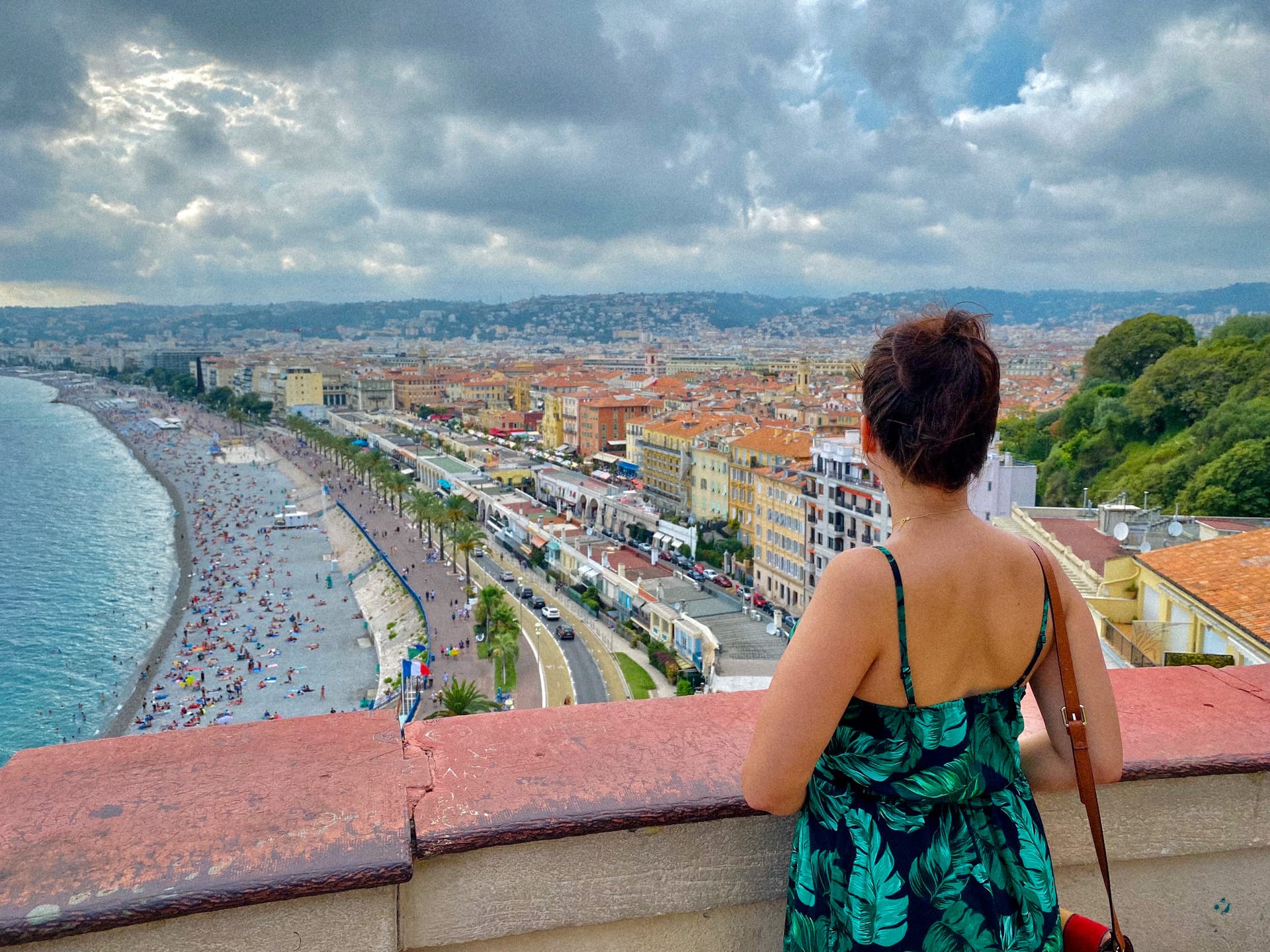 Head up to Colline du Château — Castle Hill — for one of the best views on the entire route. A quick note on the name: there’s no longer a castle here. The château was demolished in the early 18th century and the hill is now a beautifully kept park, but the panorama over the terracotta rooftops, the sweep of the Baie des Anges and the old port below it is genuinely spectacular. You can walk up from the old town, but if you’d rather save your legs, there’s a free lift (elevator) from the Quai des États-Unis end of the beach — well worth knowing about, especially in the heat of summer.